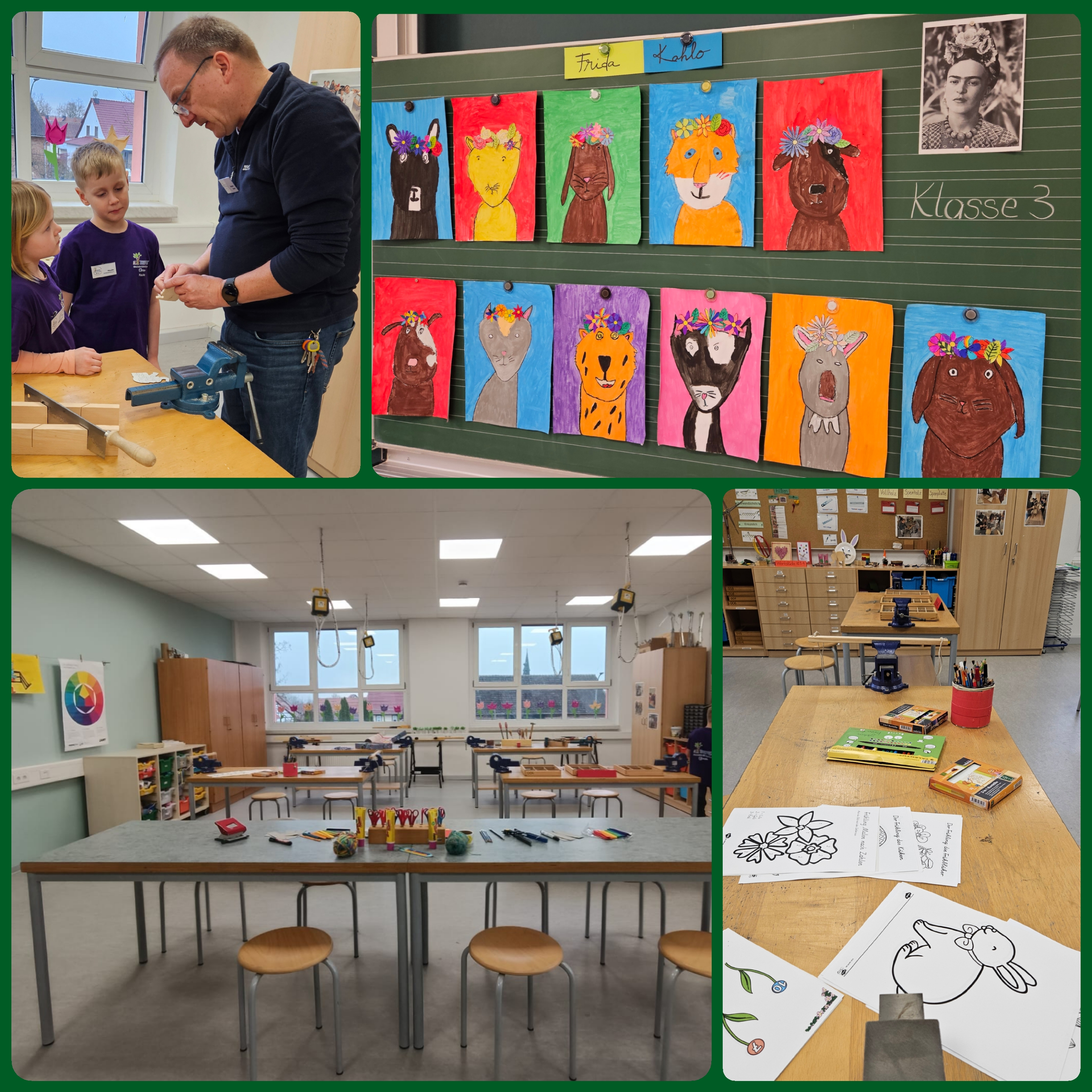 Allein oder im Rahmen von geführten Touren in Begleitung unserer Schülerparlamentsmitglieder konnten unsere Besucher einen Blick in verschiedene Klassen- und Fachräume werfen und sich u.a. über den Daltonplan und die Arbeit mit den Pensen, Englischunterricht ab Klasse 1, Ethik und Religion, Medienbildung in der Grundschule oder individuelle Förderung informieren. Im Speiseraum gab es neben der Kurzvorstellung des Konzepts und verschiedenen Snacks und Getränken auch unser traditionelles Daltoni-Suchspiel und einen Infostand unseres Fördervereins. Unsere kleinen Besucher konnten sich zudem an kreativen Bastelangeboten und Lernspielen ausprobieren.